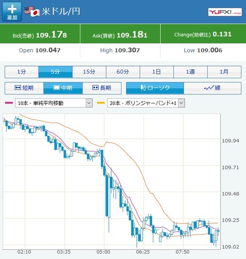 昨日の株価大暴落に引っ張られて、こちらも一気に109円割れギリギリのところまで。