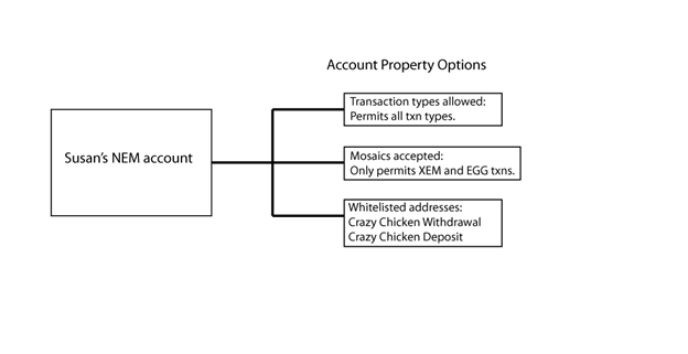 アカウントプロパティは、スマートコントラクトと同様に、ブロックチェーンのアカウントができることとできないことを決定する「スマートルール」のセット。ユーザーはアカウントのプロパティを使用し、アドレスと取引種類、モザイクID(トークン)に基づいて取引を許可またはブロックすることができる。指定されたアドレスへ、特定のモザイク(トークン)の移動のみのトランザクションを許可することもできる。