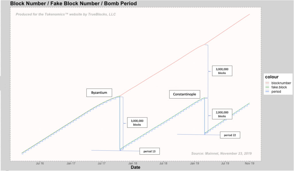 ビットコインとは異なり、イーサリアムのディフィカルティボムはブロックをマイニングする時間を10万ブロックごとに通常10〜20秒増やす。ディフィカルティボムはブロックがマイニングされるタイミングに基づくため、ネットワークがその影響を感じる時を見極めることは、科学というよりは技術だ。