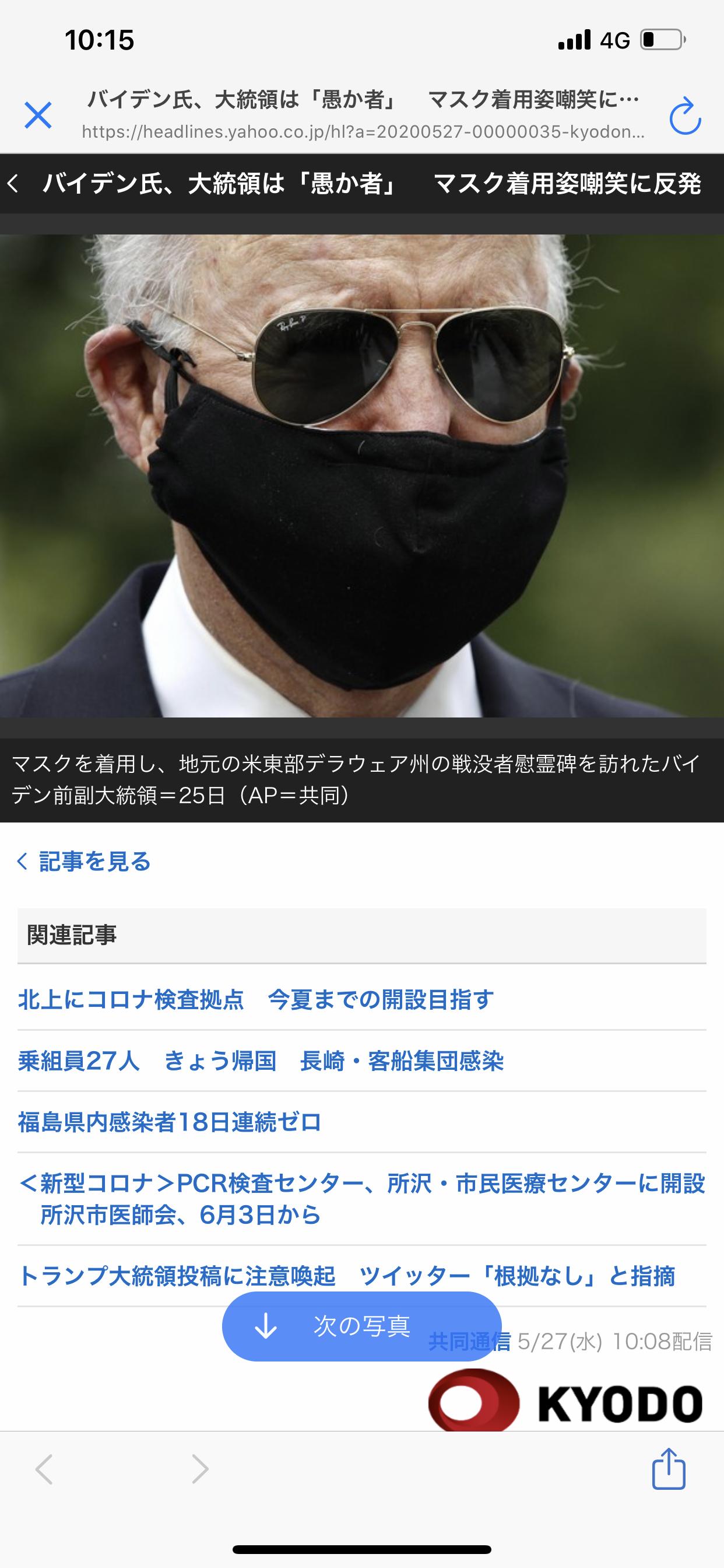 共同通信バイデン氏、大統領は「愚か者」 マスク着用姿嘲笑に反発