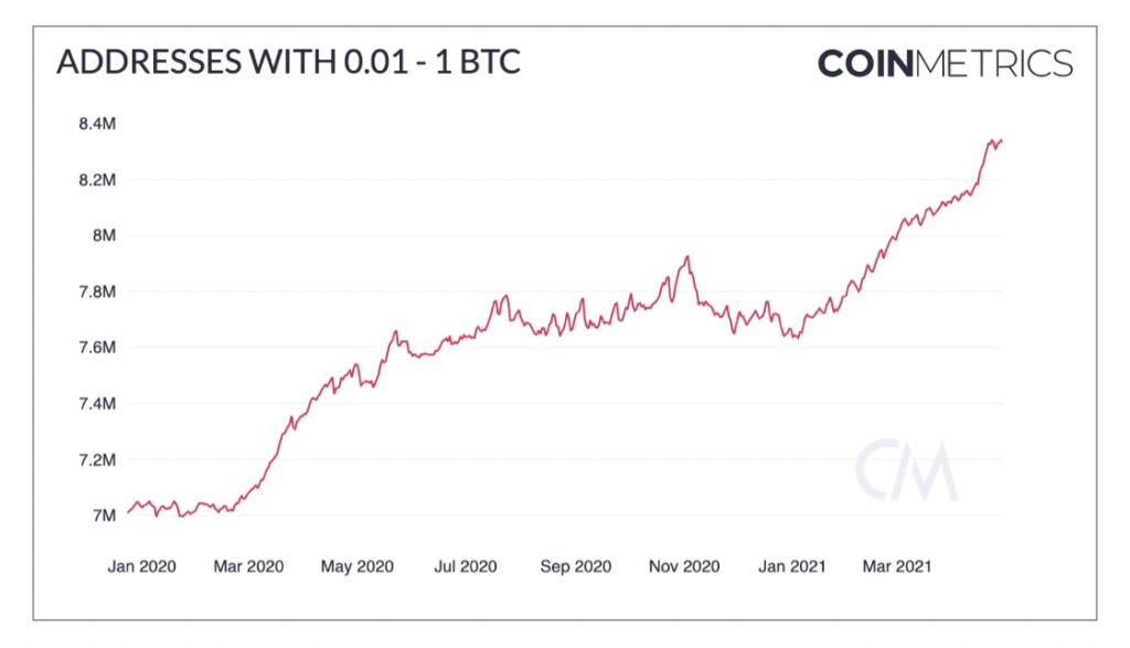 - 「比較的少額(0.01~1ビットコイン)を保有するアドレス数は、4月に急増し、年初からは71万件増加している」