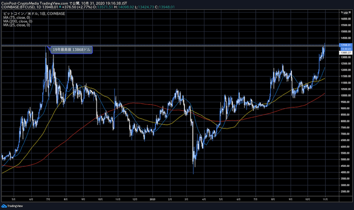 暗号資産(仮想通貨)ビットコインは31日、19年の最高値14,000ドル(147万円)を上回った。