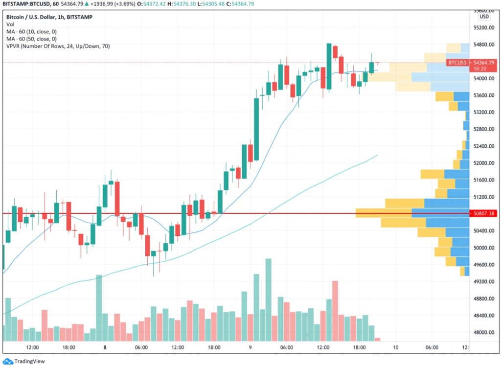 テクニカルアナリストらは、5万4000ドル付近まで上昇したことでビットコインは2月に記録した最高値5万8000ドル超えに向けて再び上昇し、さらに6万ドルに達する可能性があると予想する。