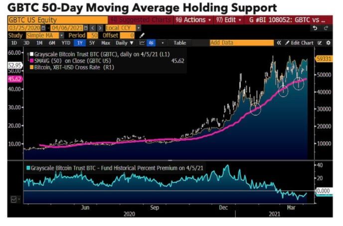 またレポートは、機関投資家に人気のグレイスケール・ビットコイン・トラスト(GBTC)が最近、ビットコインの現物価格を下回る水準で取引されていることは、米国でのビットコインETF(上場投資信託)承認に向けた期待の高まりの結果としている。GBTCは依然として、これまでバイヤーを引きつけてきた50日移動平均支持線を上回る水準で取引されている。