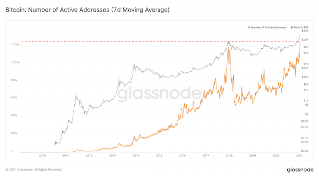 アクティブアドレスの数、非流動的なBTCの数、ハッシュレート、クジラ(大口投資家)の数など、様々な要素が過去最高水準に達しているとツイート。以下は11日のGlassnodeのレポートに掲載されたグラフで、アクティブアドレス数(オレンジ)の推移を表しており、仮想通貨バブル期を超える水準に達していることが分かる。