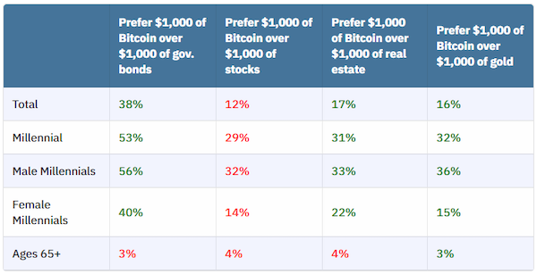 特にミレニアル世代の回答者で顕著で、その45%が株式、不動産、金よりもビットコイン投資を好むような傾向を示しているという。