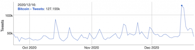 CoinPostが提携する仮想通貨メディアTheBlockのリサーチによると、12月13日までの週では24万2180だったツイート数が、20日までの週では42万8280まで増加。ビットコイン(BTC)が2万ドル(約207万円)を超えるなど、多くの取引所で過去最高値を塗り替えたのは日本時間の16日だ。