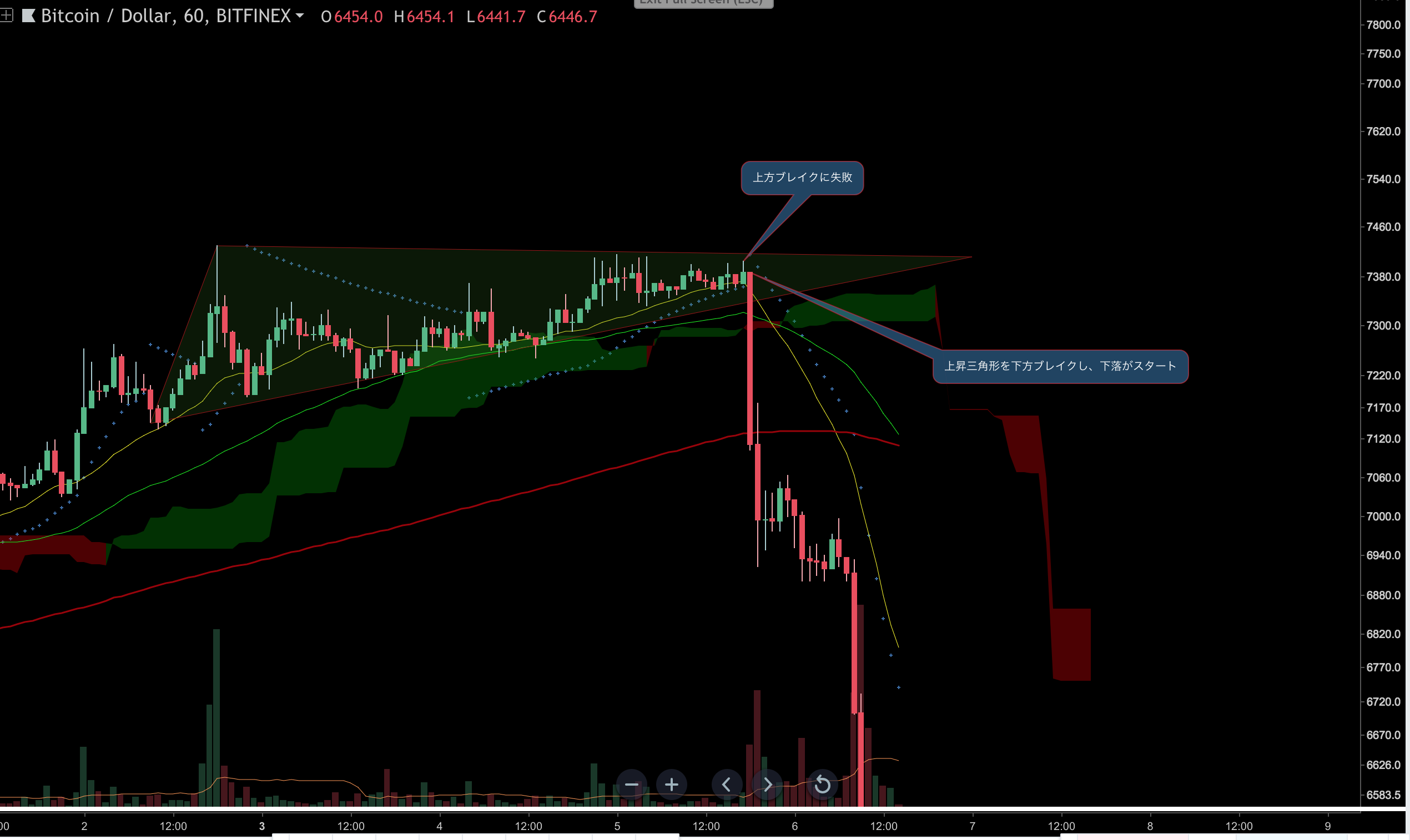 ビットコインが上昇三角形を下方にブレイクしたことがきっかけとなり下落が始まりました。