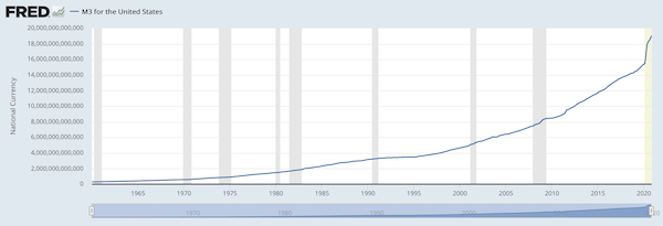 米セントルイス連邦準備銀行の統計によると2020年11月時点での米ドル流通量は19兆ドルまで増加している。