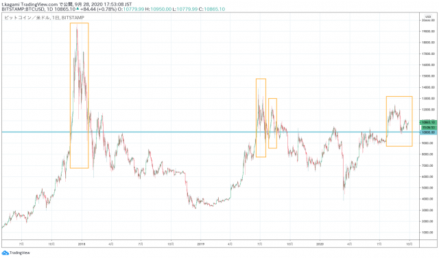 仮想通貨バブルとされる2017年12月1日から62日間続いた記録を更新した。17年当時と比較して最高値の更新はなく、ボラティリティ(価格変動性)は低いものの、1万ドルをサポートライン(下値支持線)にした底堅い値動きが続いている。