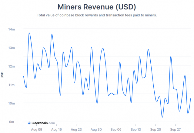BTC価格は今年7月から8月にかけて25%上昇し、9月には約8%の下落を見せた。それに伴い、マイナーの収益も減少に転じた格好だ。