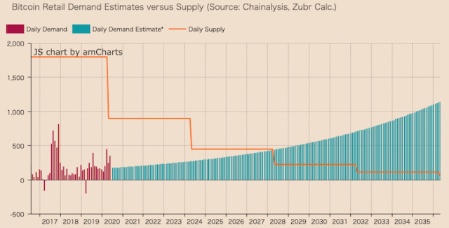 仮想通貨(暗号資産)デリバティブ取引所のZUBRが、マイニングによって新規供給されるBTCの量と、小口投資家に限定した需要を比較。次の半減期を予定する2024年には新規供給量の半分を、さらに次の半減期の2028年では小口投資家の需要だけでその供給を上回ると試算した。もちろん小口投資家がBTCを入手するペースが速まったり、他の投資家を対象に入れれば需要が新規供給量を上回る時期は早まる。