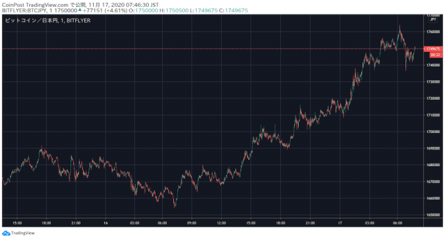 ビットコイン(BTC)が日本円建で176万円に達し、再び年初来高値を更新した。