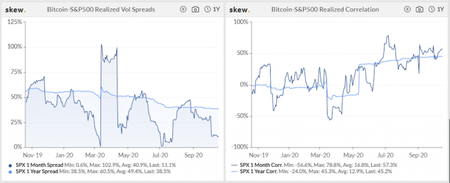 ビットコインと米国株式市場(S&P)は、コロナショックの3月以降、再び正の相関性を高める傾向が続いていた(skew.)が、底堅く推移するBTC市場が伝統資産市場とデカップリング(相関関係の乖離)の傾向を示したことを強気と指摘する有識者も出てきている。