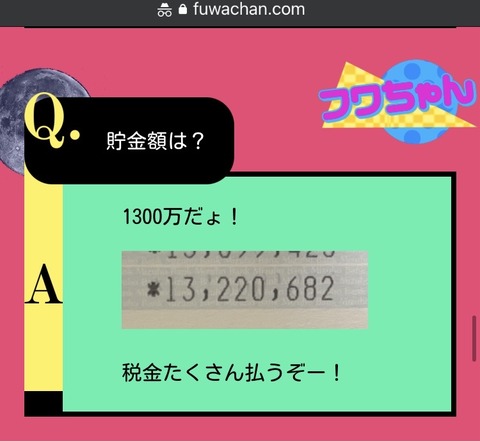 Homepageマネー総合 masakatsu7733 4年 ago Categories: マネー総合 フワちゃんの貯金額wwwwwwwww 1: 稼げる名無しさん 2022/07/17(日) 11:05:15.99 ID:FtuSMJ1jp.net フワちゃんの貯金額は1300万円らしいぞ 公式サイトより 1001: 以下名無しさんに代わりまして管理人がお伝えします 1848/01/24(?)00:00:00 ID:money_soku 超有名人なのにちょっと少なすぎでは? まあもっとありそうだよな。 続きを読む Source: 稼げるまとめ速報 【画像】新幹線にジョーカーいたwwwwww » « 【緊急】山上のTwitter、発見されるWWWWWWWWWWWWWWWWWWWWWW masakatsu7733: Related Post PR広告:あなたもお釣り投資を始めませんか? ■ 利用開始3か月間は月額利用…