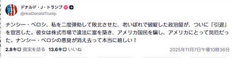米民主党重鎮のナンシー・ペロシ元下院議長(85)は6日、X(ツイッター)に投稿したビデオ声明で、2026年11月の次期下院選への立候補を見送る意向を表明した。「再選は目指さない。最後の1年の奉仕を楽しみにしている」としている。ペロシ氏は女性初の連邦下院議長で、トランプ大統領と激しく対立してきた。