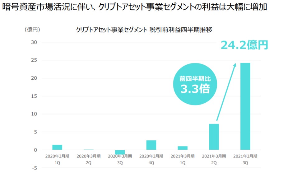 暗号資産取引所のコインチェックを傘下に持つマネックスグループは29日、4月~12月期の連結税引き前利益が前年同期からほぼ3倍に増え、89億円になったと発表した。そのうち、暗号資産事業の利益は3.3倍の24.2億円となり、過去最高を記録した。