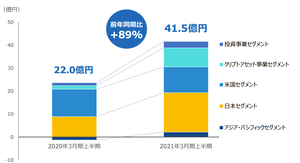 クリプトアセット事業では、(コロナ禍に伴う)金融緩和を背景とする暗号資産市場活性化と、アルトコインの取引高増加により、セグメント利益は7億円(前四半期比7倍)で、グループ入り後最高益を達成した。