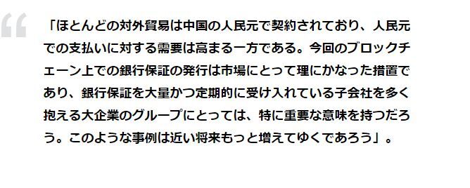 モスクワ信用銀行は、ロシア国内で初めてブロックチェーン上で中国人民元建の銀行保証を発行した。この銀行保証の額面は1億人民元超となっており、発行時のレートで約14,460,000ドルに相当する。