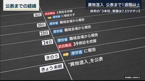 ただ、気になるのは公表のタイミングです。武田薬品によりますと、最初に事態を把握したのは16日でしたが、健康に影響があるかどうかわからなかったため、厚労省には伝えていなかったといいます。しかし、日を追うごとに報告が増え、25日に初めて厚労省に伝えたということです。一方の厚労省も、20日には接種会場から報告があったそうですが、武田薬品の報告を待って公表した形です。