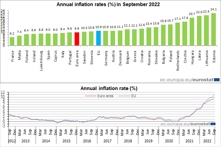 水曜日の欧州連合の統計局ユーロスタットによると、ユーロ圏の年間インフレ率は、8 月の 9.1% から 9 月には 9.9% に上昇しました。9 月のインフレ率は 40 年ぶりの高値を記録し、投資家はユーロ圏が「金融崩壊の危険にさらされている」と疑っています。