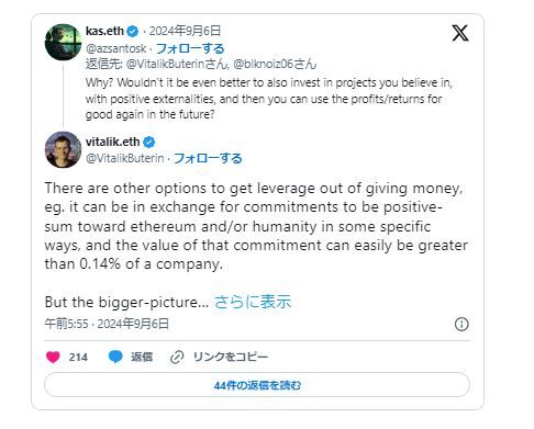 ブテリン氏は、寄付金を活用するより良い方法があると指摘した。同氏は、L2に投資する代わりに、イーサリアムや人類に対してプラスサムとなる約束と引き換えにプロジェクトに寄付できると述べた。
