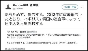 警視庁世田谷署は韓国籍の自称プログラマー、金輝俊(キム・フィジュン)を現行犯で逮捕した。金容疑者は「そんなことしていません」と容疑を否認しているが、本人と思われるツイッターには日本人に対する大量虐殺の予告が投稿されていることが判明した。