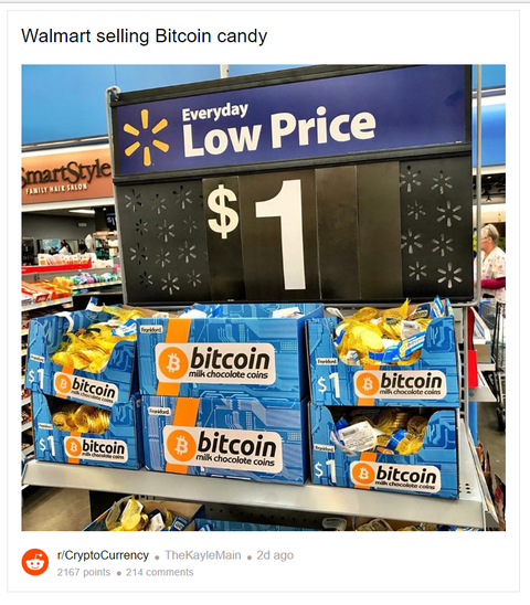 米国の世界最大スーパーマーケットチェーンのWalmartは1ドルのビットコインチョコレートを売り出した。