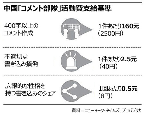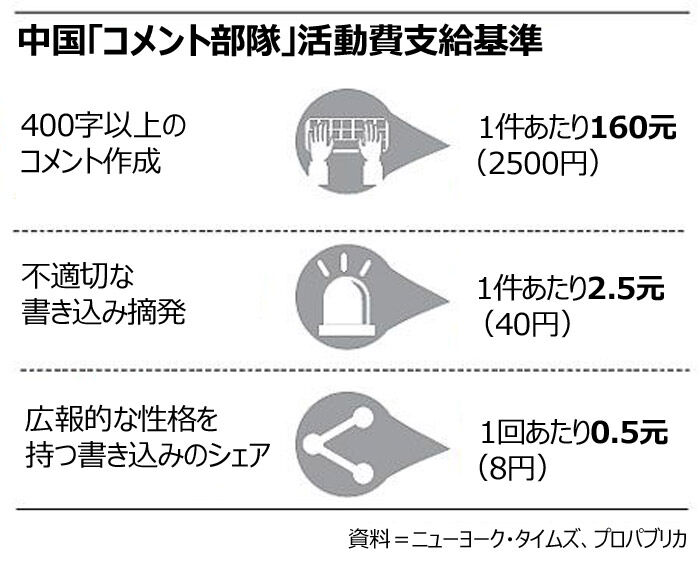 ・400字以上の新規コメント作成 1件あたり160元・不適切な書き込みを中国当局へ通報 1件あたり2.5元・中国広報的な書き込み 1件あたり0.5元 (8円)画像https://i.imgur.com/hR6IGdH.jpg中国政府が新型コロナウイルス感染拡大初期の今年1月から、自国のインターネット世論をどのように操作・統制していたかを赤裸々に示す文書が公開された。今月19日(現地時間)、米紙ニューヨーク・タイムズ(NYT)と米インターネット非営利調査報道機関プロパブリカ(ProPublica)は新型コロナ以降、中国政府が世論を統制するために作成した文書や各種の指針、合計5000件を分析して報道した。この文書は、ソーシャル・メディアやインターネット・ニュースを管掌する中国政府機関「網信辦(中国インターネット情報弁公室)」杭州支局と政府協力会社の「雲潤大数据(雲潤ビッグデータ)」から最近ハッキングされたものだ。NYTは「中国政府の世論統制は秘密ではないが、そのためにどれだけ多くの政府機関やメディアが動員され、技術や資金が投入されているのか公になったのは異例だ」と伝えている。NYTが確保した内部文書によると、コメント工作員は400文字以上の書き込みを1件作成すれば160元(2500円)、不適切な書き込みを1件摘発すれば2.5元(40円)、広報的な性格を持つ書き込みで「シェアする」を1回クリックすれば0.5元(8円)を受け取ったという。2013年にハーバード大学が発表した論文では、中国のコメント部隊の規模は数十万人と推定され、このうち相当数が「『副業』の政府機関職員」だとのことだ。イ・ボルチャン記者朝鮮日報 2020/12/21