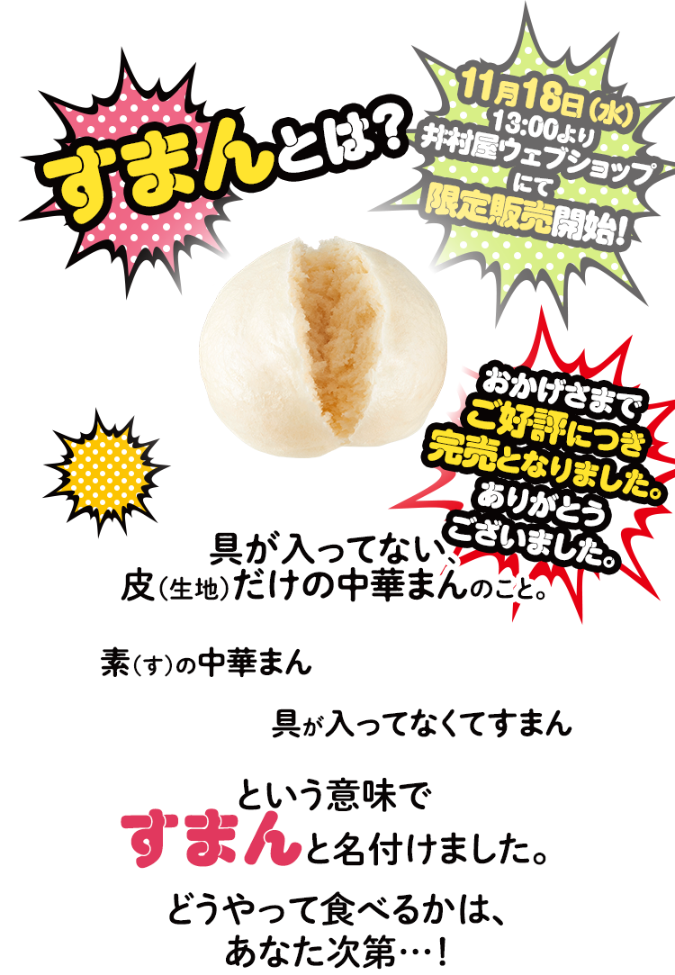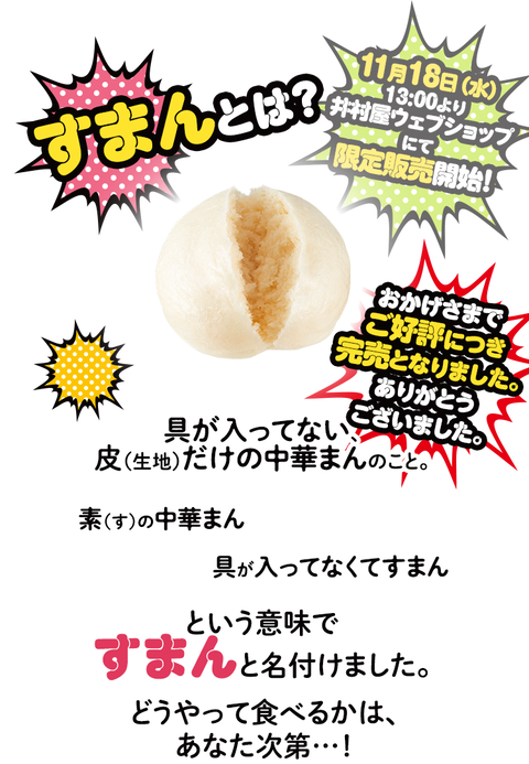 東海TV肉まんや、あんまんでお馴染みの「井村屋」が2020年、新しい中華まんを発売しました。今までの常識を覆す具が入っていない“生地だけ”の中華まん「すまん」です。具は詰まっていないけど、井村屋の自信と遊び心は詰まった生地だけの「すまん」はSNSで話題となり、2か月で完売しました。■“素まん”と“すみません”で『すまん』…もっちりとした生地が自慢の具の無い“中華まん”全文