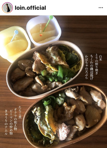 とりの照り焼き、チクワの磯辺揚げ、かぼちゃの天ぷら、ピーマンの炒め物、たらこ煮など豊富なおかずが並び、フルーツも添えられている。ハッシュタグでは「#もう大人サイズ」とつづった。