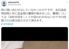 返金するための封筒が支援者の元に送られてきたようでTwitterに報告されている。その返信用封筒と共に書類が入っており、書類には「法的手段を~」と言われかねない内容だという。具体的なことは書かれていないが、おそらく返金に応じたら一切SNSやネットに書かない、過去の投稿も削除してほしいと言う内容、または書類に関しても表に出してはいけないというものなのだろう。