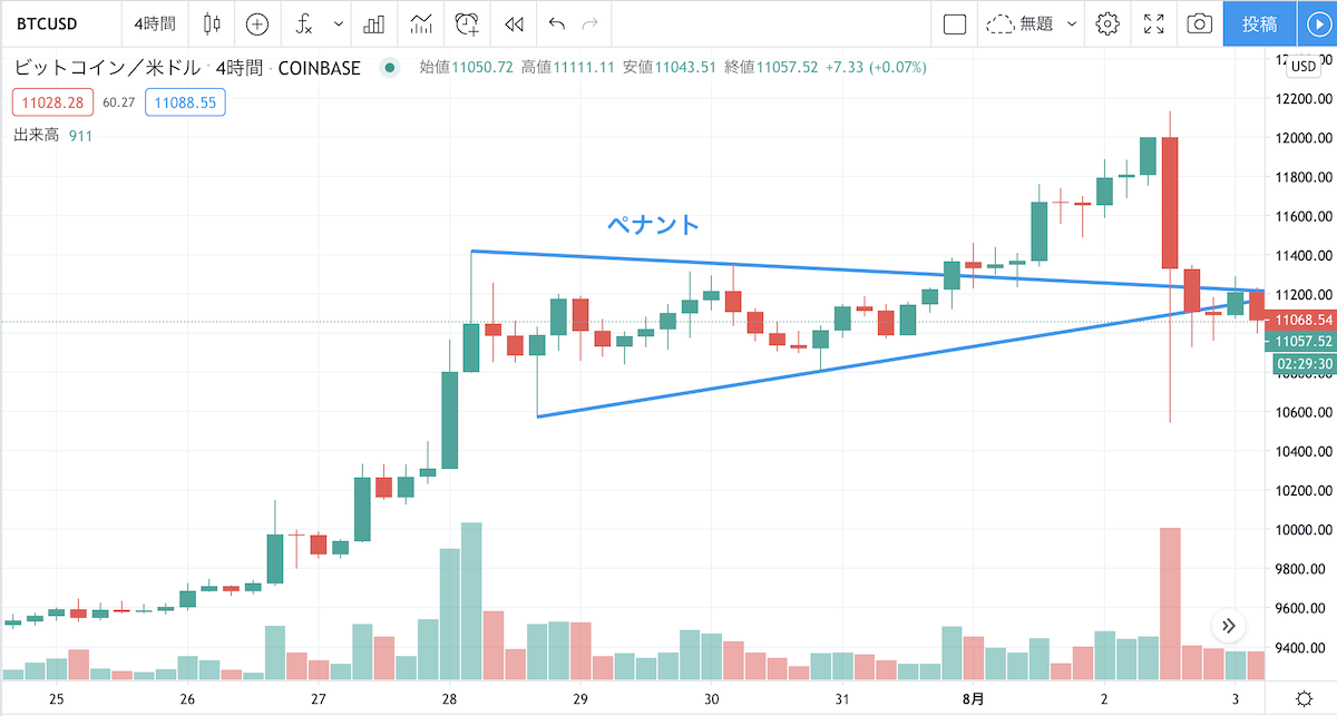ペナントは俗に言う三角保ち合いです。下記がペナントの実例です。