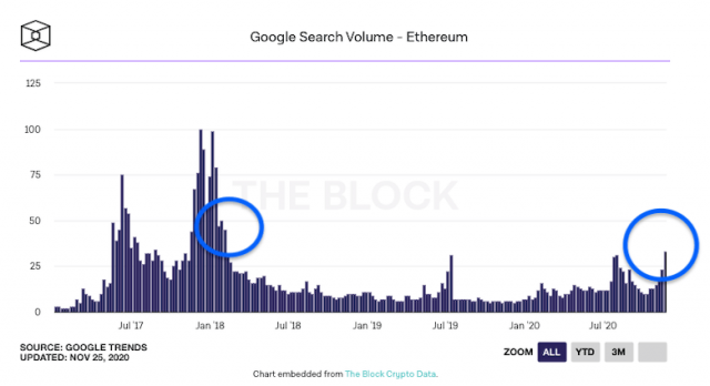 ETHの価格高騰に伴い、「イーサリアム(ethereum)」の検索数はバブル相場が弾ける2018年2月の水準に戻りつつある。CoinPostと提携する米仮想通貨メディアTheBlockは0〜100という指標でグーグルの検索数を測定。バブル相場がピークを迎える2017年12月では検索数の指標が100に達し、2018年2月4日まで45以上の水準を維持していたが、価格の続落に伴い、検索数も大幅に減少。