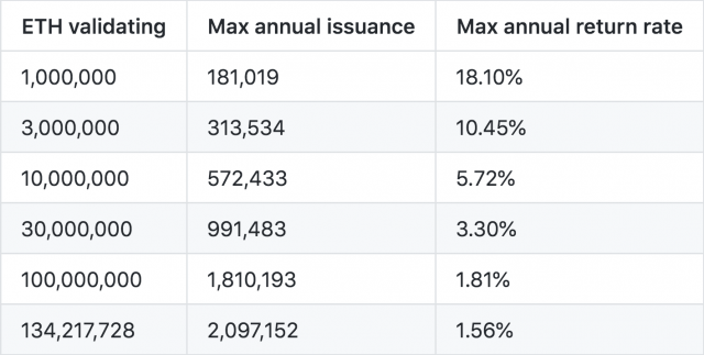 例えば、100万ETHがステークされた場合、最大の年間報酬レートが18.1%なので、最大181,019ETHが新たに発行されることになる。また、最大の年間発行額は2,097,152ETHとなっている。