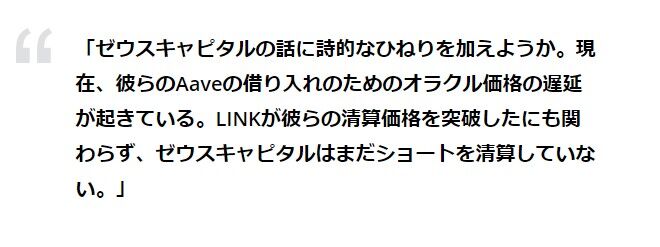 LINKの上昇には資産運用会社ゼウスキャピタル(Zeus Capital)の動きにも注目が集まっている。同社はチェインリンクに懐疑的な市場を示しており、これまでにLINKの価格は急落すると予想。9日の上昇を受けて次のように語っている。