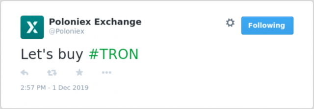 事の発端となったのは、Poloniexの公式ツイッターで「Let’s buy #TRON(TRONを買おう)」とのメッセージを投稿したことに始まる。