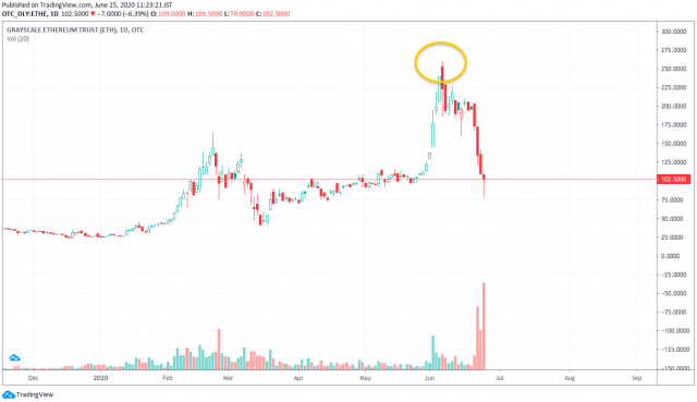 ETHEは、4日につけた年初来最高値259.52ドルから、24日には一時78ドルまで急落。最大-69.9%の下落幅を記録した。