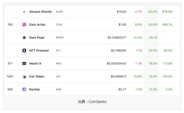 本日のNFT関連銘柄の騰落率はこちらとなる。(CoinGeckoデータ)
