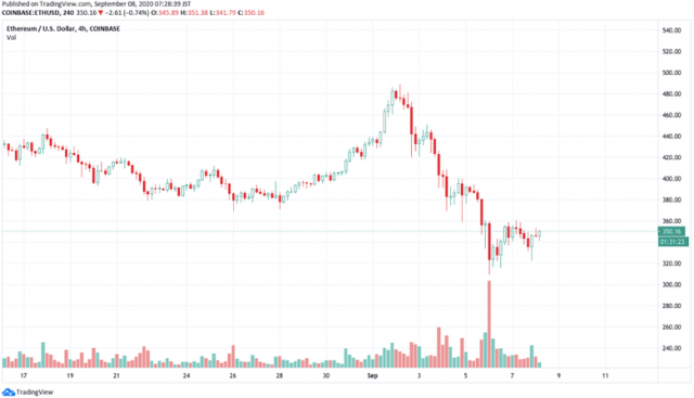 イーサリアム価格は9月2日に年初来最高値の490ドルを記録するも、DeFi分野の過熱感への警戒から、売りが優勢になると、一時300ドル目前まで市場価格が続落した。