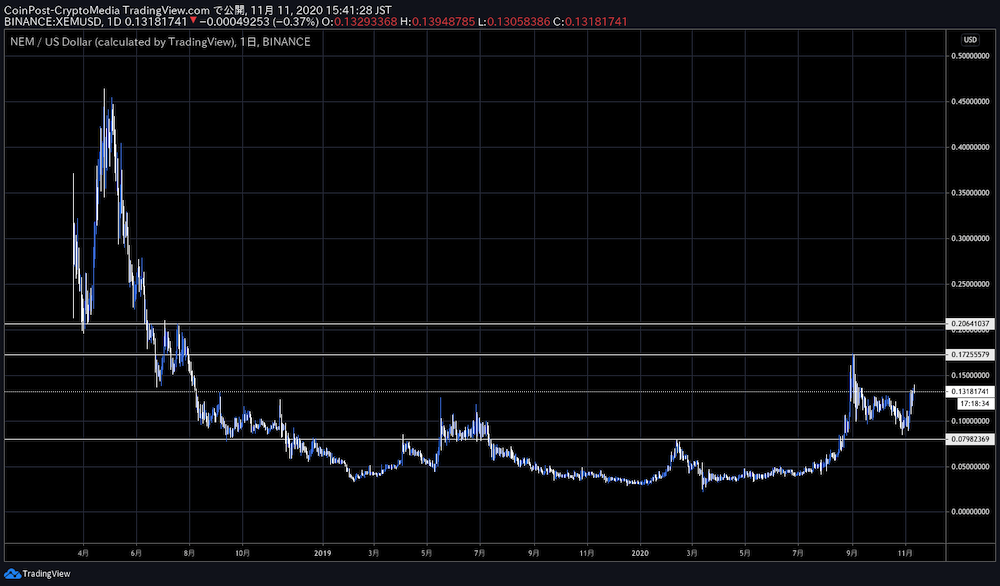 国内出来高上位の仮想通貨NEM(XEM)価格が11日にかけて続伸。前週比33.9%高で0.13ドル(14円)台を回復した。