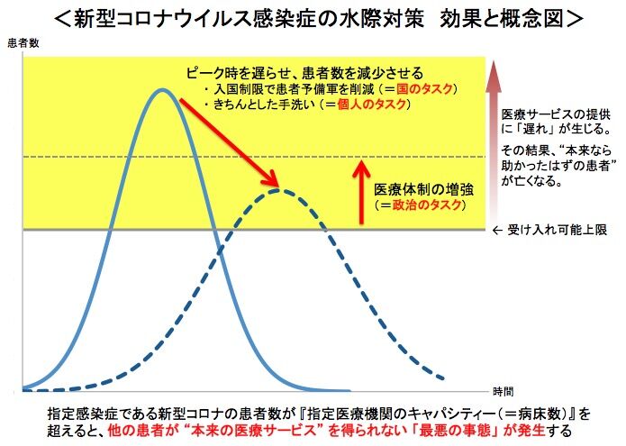 感染者数のピークを先送りさせ病院を満杯にさせあふれさせるのを防ぐ