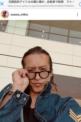 幸い打撲、打ち身のみの軽傷だったが、1週間後に今度は自転車で転倒。「チャリのカゴに水1ケース載せててバランス崩してジャリコンクリートにデコから突っ込んでコケたのよ」といい、モノクロの写真で痛々しい傷がくっきり見える写真も公開した。「あとが残っちゃったけどそのうち消えるでしょう 強烈な2度の大厄落としぢゃ!! 皆んなも自転車に乗る時は自分も周りにも気をつけよう」と前向きに呼びかけた。