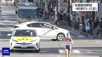 20日午前、京都で行われた「全国高校駅伝」の女子のレースでは、最終5区の3キロを過ぎた付近で、車が交通規制をしている警察官の制止を振り切ってコースを横切りました。