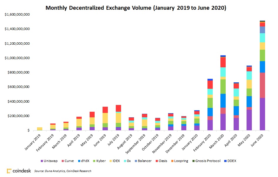 6月の取引量の拡大は、自動マーケットメーカー(AMM)における増加(170%以上の増加)がけん引した。従来のDEX(分散型取引所)の成長は10%にとどまった。