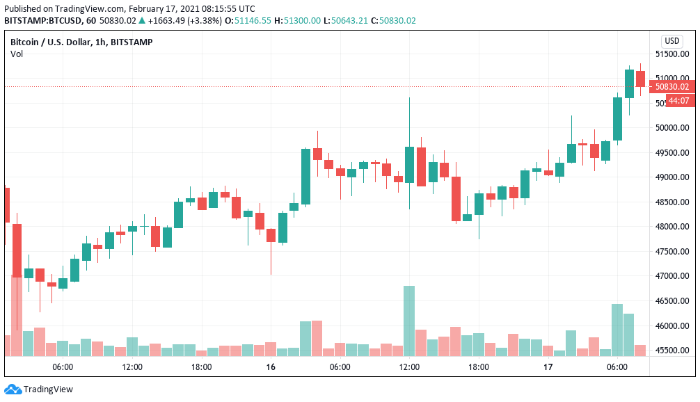 ■ビットコインが17日午後、51500ドルをつけ高値を更新した。ビットコインは前日5万ドルを初めて突破したばかり。