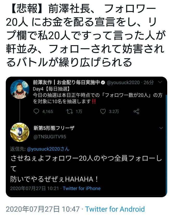 前澤社長「フォロワー20人の人にお金配ります!」→地獄絵図に