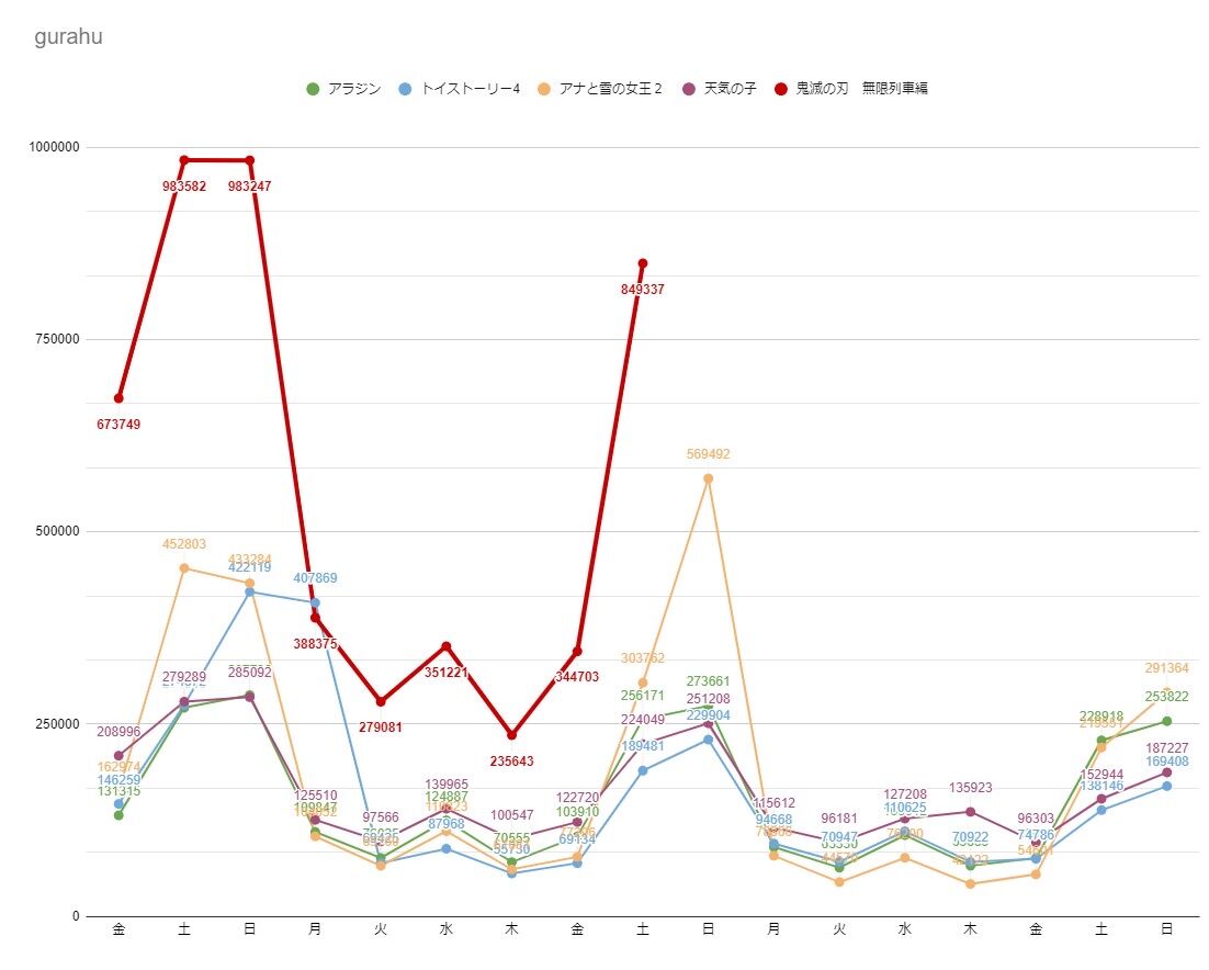 朝8:40分の時点で5万人以上動員2020/10/25 08:40更新 最新デイリー詳細速報(約20分毎更新)順位 販売(前回比) 座席(消化率) 先週比 95分率 全日推定 映画作品タイトル名*1 *53447(23812) *69920(.058) *57.7% ****** 978932 鬼滅の刃 無限列車編*2 **1222(+*304) **3072(.064) *59.8% ****** *23007 夜明けを信じて。*3 ***851(+*330) **5528(.090) *96.5% 20.2% *15872 浅田家!*4 ***778(+*295) **9344(.336) *91.4% *3.3% **5977 映画クレヨンしんちゃん 激突…*5 ***707(+*306) **4524(.252) *65.0% 21.4% **5686 映画ドラえもん 2020 の…*6 ***667(+*187) **7621(.047) ****** 16.3% *31154 きみの瞳が問いかけている*7 ***502(+*151) **4484(.423) *56.8% 25.3% **1749 トロールズ ミュージック★パ…*8 ***419(+*154) **1408(.047) *42.1% ****** *11071 劇場版 ヴァイオレット・エヴ…*9 ***394(+*178) **3319(.075) ****** 20.1% *11931 空に住む10 ***338(+*148) **2711(.037) *44.9% 10.9% *24309 TENET テネット■国内映画歴代デイリー販売数記録*1 983582 2020/10/17(土) 鬼滅の刃 無限列車編*2 983247 2020/10/18(日) 鬼滅の刃 無限列車編*3 849266 2020/10/24(土) 鬼滅の刃 無限列車編*4 673749 2020/10/16(金) 鬼滅の刃 無限列車編*5 569492 2019/12/01(日) アナと雪の女王2*6 452803 2019/11/23(祝) アナと雪の女王2*7 433284 2019/11/24(日) アナと雪の女王2*8 422119 2019/07/14(日) トイ・ストーリー4*9 415451 2019/04/14(日) 名探偵コナン2019 紺青の拳10 407869 2019/07/15(祝) トイ・ストーリー4■興収100億円到達した日数(10日 鬼滅の刃 無限列車版 (最終???億円))25日 千と千尋の神隠し (最終308.0億円)28日 君の名は。 (最終250.3億円)28日 ハリー・ポッターと賢者の石 (最終203.0億円)29日 踊る大捜査線2 (最終173.5億円)31日 崖の上のポニョ (最終155.0億円)32日 ハリー・ポッターと秘密の部屋 (最終173.0億円)33日 ハウルの動く城 (最終196.0億円)34日 天気の子 (最終141.9億円)37日 アナと雪の女王 (最終255.0億円)37日 アリス・イン・ワンダーランド (最終118.0億円)40日 アナと雪の女王2 (最終255.0億円)41日 アラジン (最終121.6億円)42日 美女と野獣 (最終124.0億円)43日 もののけ姫 (最終193.0億円)スレ立て用ソース『鬼滅の刃』の特大ヒットは「規格外のすごさ」。コロナ禍の映画産業を救う突破口になるか『劇場版「鬼滅の刃」 無限列車編』が、3日間(10月16日~18日)の興行収入が46億円超えという驚異的な数字でスタートを切った。最終興行収入が100億円に達すれば「大台に乗った」と言われる映画産業において、3日でおよそその半分の数字を稼ぐという、異例の出来事が起こった。