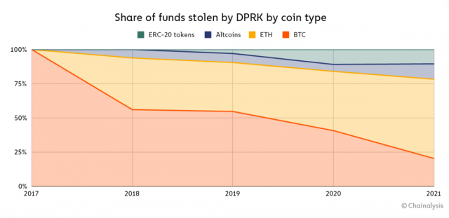 北朝鮮によるサイバー攻撃は、同国が管理するハッカー集団「ラザルス(Lazarus)」が主導しているとされる。2021年、北朝鮮に盗まれた仮想通貨は、58%がイーサリアム(ETH)だった。ERC-20トークンとアルトコインはそれぞれ22%で、ビットコイン(BTC)は全体の約20%にすぎなかった。