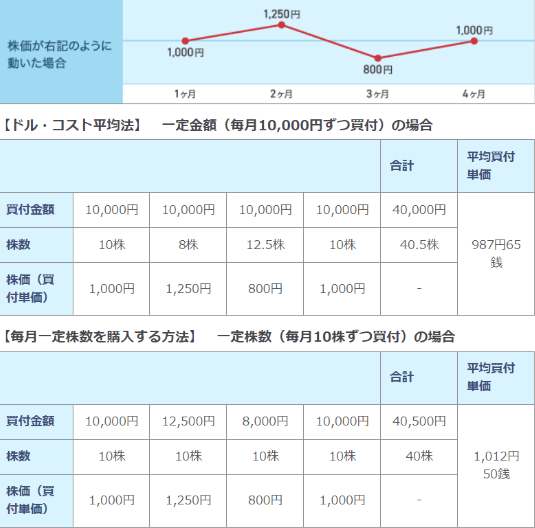 ドルコスト平均法を用いることで、金融商品を購入するタイミングを分散し、その価格を平均化します。つまり、標準価格より値上がりしている相場では購入数が少なくなり、反対に、値下がりしている相場では購入数が多くなるのです。